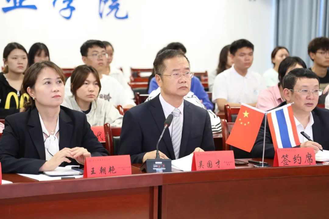 签约仪式上,吴国才介绍了学院办学情况,对学院与泰国东方皇家理工大学的深度合作表示热烈祝贺。他指出,泰国东方皇家理工大学是1903年经泰国教育部认证的一所公立大学,学科门类广泛,具有先进的办学理念。希望今后两校进一步深化在教学、科研及师生互访方面的合作交流,共创发展新篇章。