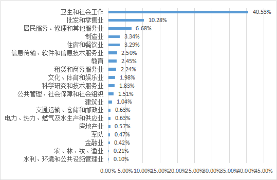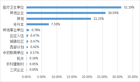 在所有签订协议书就业的毕业生中,57.49%的毕业生集中在医疗卫生系统、居民服务、修理和其他服务、批发和零售业等行业。