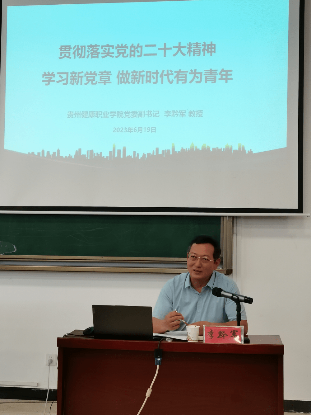 6月19日,学院党委副书记李黔军在15-1-100阶梯教室以“贯彻落实党的二十大精神 学习新党章 做新时代有为青年”为主题,为健康管理系师生上了一堂别开生面的专题党课。健管系全体教职工、教工党支部、学生党支部全体党员、预备党员、发展对象和入党积极分子参加。