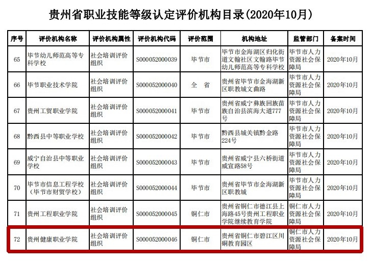为做好职业技能等级认定工作,根据国家职业技能等级认定相关政策文件,在省、市人力资源和社会保障部门的指导下,我院积极向相关部门申报了职业技能等级认定机构。经资料审核、验收、备案等相关程序,我院成为了贵州省首批107家职业技能等级认定评价机构之一,未来具备了在铜仁市内开展相关职业技能等级认定工作的资质。为进一步促进毕业生就业、大力提升学院服务社会能力及综合实力,打造铜仁市医、护、药、养及大健康专业方向职业技能人才认定机构奠定了基础。