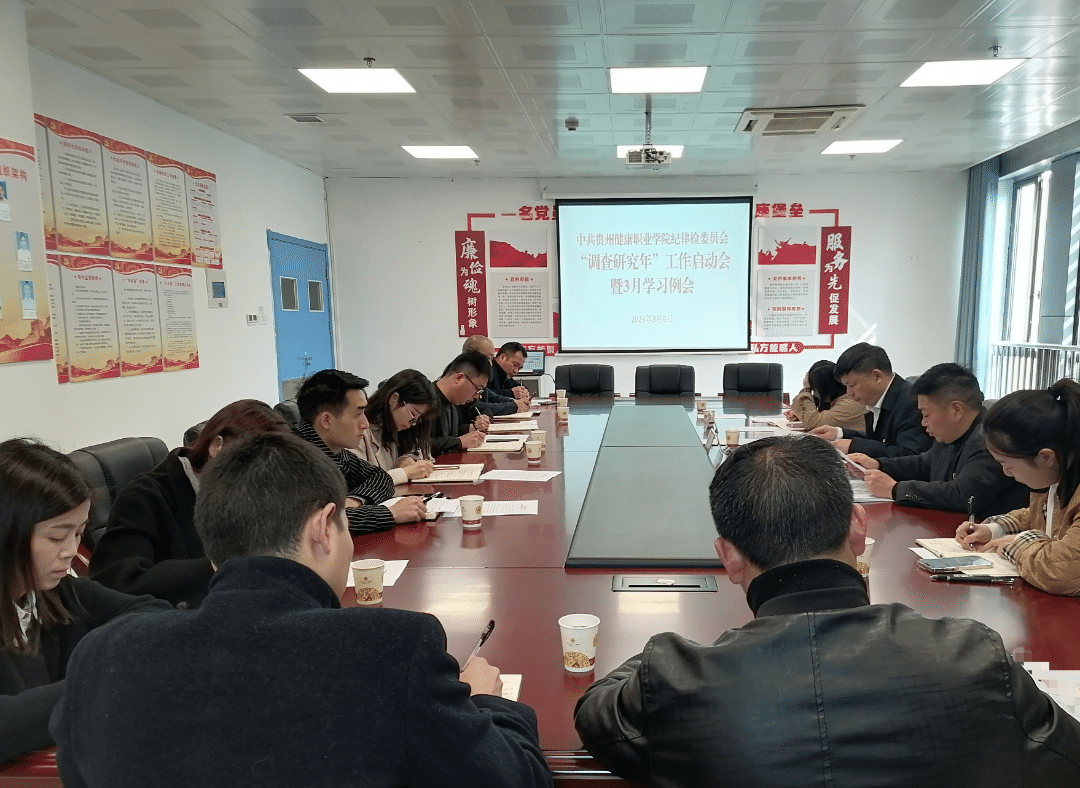 会议组织学习了习近平总书记在中共中央政治局第三次集体学习时重要讲话和在中央党校建校90周年庆祝大会暨2023年春季学期开学典礼上重要讲话精神,传达学习了中国共产党第二十届中央纪律检查委员会第二次全体会议精神、中国共产党贵州省第十三届纪律检查委员会第二次全体会议精神、中国共产党铜仁市第三届纪律检查委员会第三次全体会议和市纪委市监委业务推进暨“调查研究年”启动会议精神,审议了学院纪检监察“调查研究年”工作方案,并安排全年纪检监察工作。
