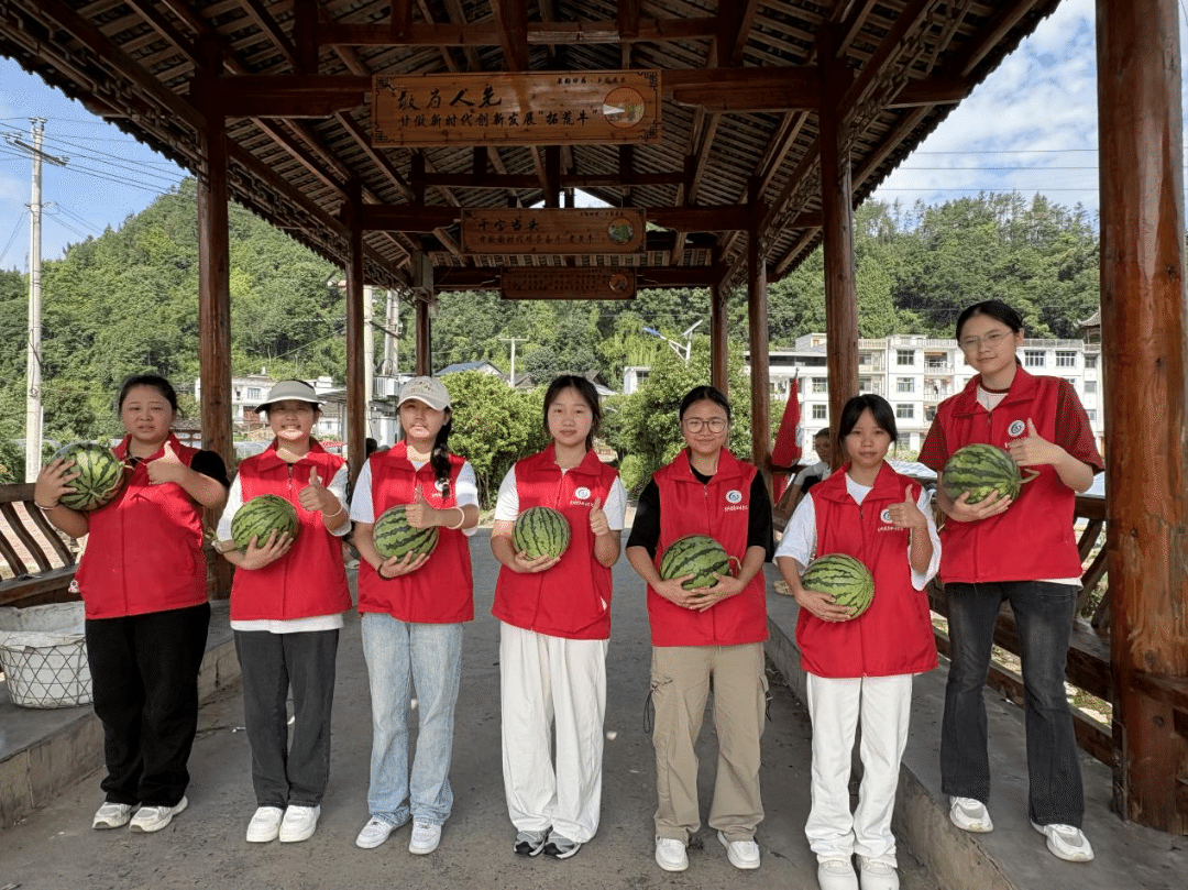 时值盛夏,正是老寨村西瓜丰收的季节。同学们走进西瓜种植基地,以“西瓜T台秀”形式助力农产品推广。队员们怀抱西瓜,在风雨桥上自信走秀,通过短视频平台进行网络宣传,用青春活力为当地特色农产品代言,帮助瓜农拓宽销售渠道。
