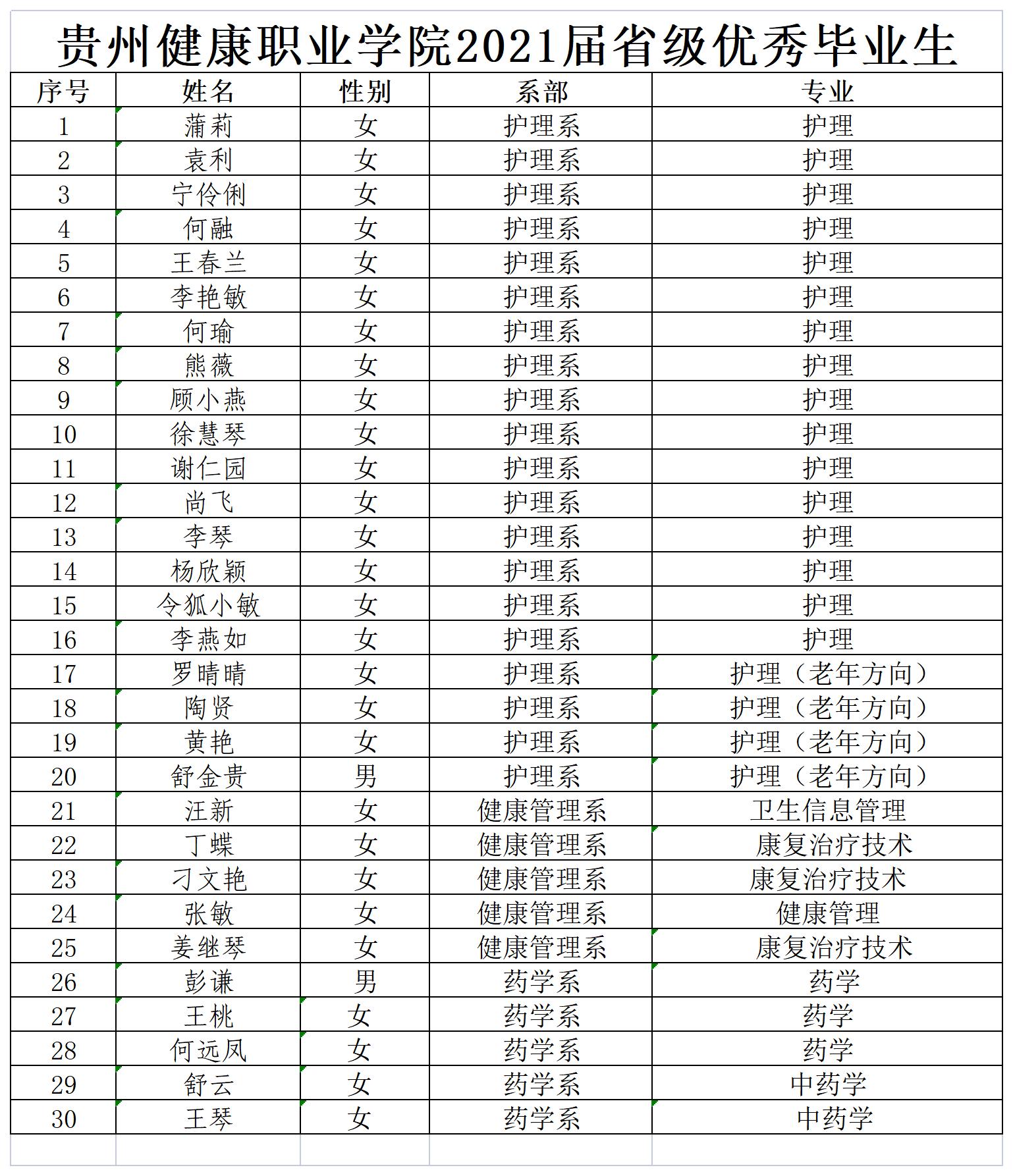 根据省教育厅《关于2021届贵州省普通高等学校优秀毕业生评选结果的通报》(黔教发(2021)15号),我院本次评选的40名省级优秀毕业生是2021届毕业生的优秀代表,他们集中体现了当代大学生积极、健康、向上的精神风貌,他们在校期间具有正确的政治方向、优秀的道德品质和正确的世界观、人生观、价值观,他们刻苦学习、成绩优异勤于实践、甘于奉献,积极承担各类社会工作,充分发挥模范作用。希望其他在校学生坚定政治方向,明确奋斗目标自觉践行社会主义核心价值观,刻苦学习、勤于实践、立志成才,努力提升综合素质,做德智体美劳全面发展的社会主义建设者和接班人。希望各位优秀毕业生继续发扬成绩,在全面建成小康社会的伟大事业中作出积极贡献,实现青春的价值、人生的精彩。