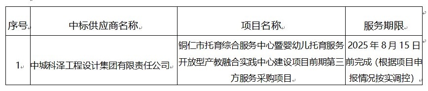 铜仁市托育综合服务中心暨婴幼儿托育服务开放型产教融合实践中心建设项目前期第三方服务采购项目中标(成交)公示