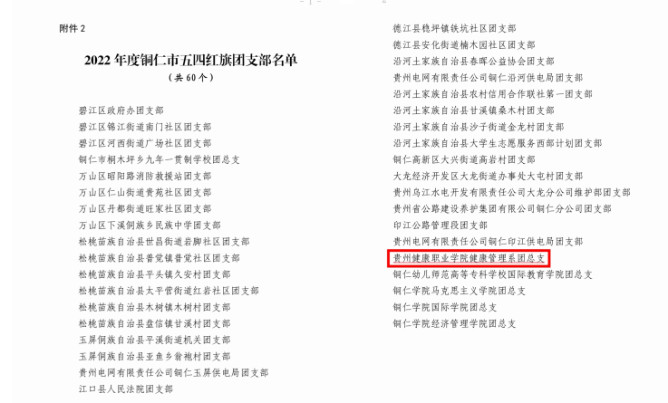 近日,共青团铜仁市委员会下发《关于表彰2022年度铜仁市五四红旗团委(团支部)、铜仁市优秀共青团员、铜仁市优秀共青团干部的决定》,我院健康管理系团总支荣获2022年度铜仁市五四红旗团支部荣誉称号。
