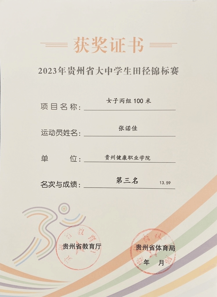 7月29日,由贵州省教育厅、贵州省体育局主办的2023年贵州省大中学生田径锦标赛圆满结束,比赛在高职高专丙组共设27个项目(女子13项、男子14项),我院学生张诺佳获100米“铜牌”和跳远第四名,唐海南获跳高项目第四名,团体总分在31所高职院校中排名17名。