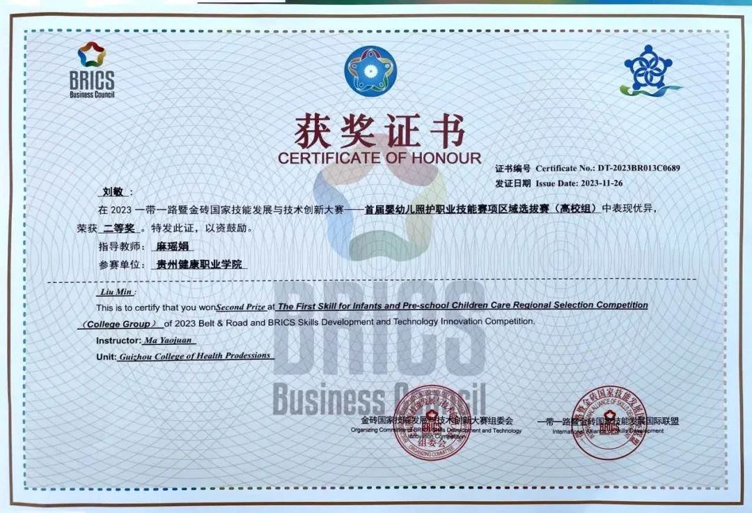 11月26日,由金砖国家工商理事会中方理事会、“一带一路”暨金砖国家技能发展国际联盟、中国科协“一带一路”暨金砖国家技能发展与技术创新培训中心主办的2023“一带一路”暨金砖国家技能发展与技术创新大赛首届婴幼儿照护职业技能赛项区域选拔赛(第十一场),在昆明幼儿师范高等专科学校举行,我院护理系学生刘敏喜获二等奖。