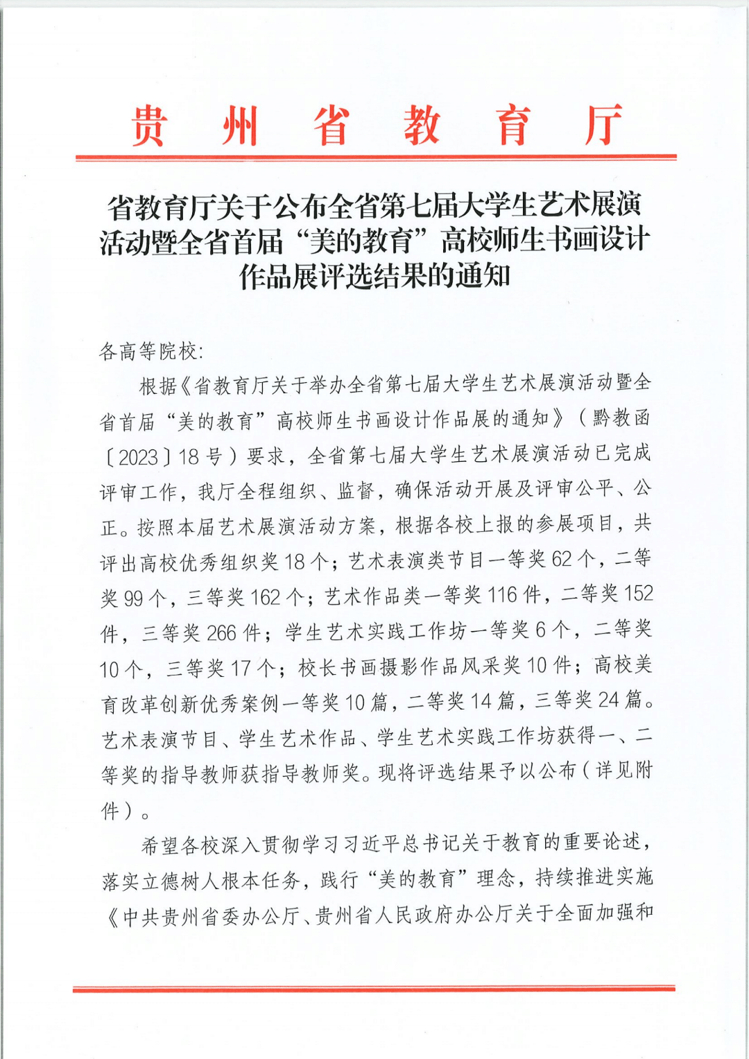 近日,省教育厅公布了全省第七届大学生艺术展演活动暨全省首届“美的教育”高校师生书画设计作品展活动评选结果,我院在65所高校、2500项报送作品中脱颖而出,共荣获7项奖项,其中,一等奖3项、二等奖2项、三等奖2项。