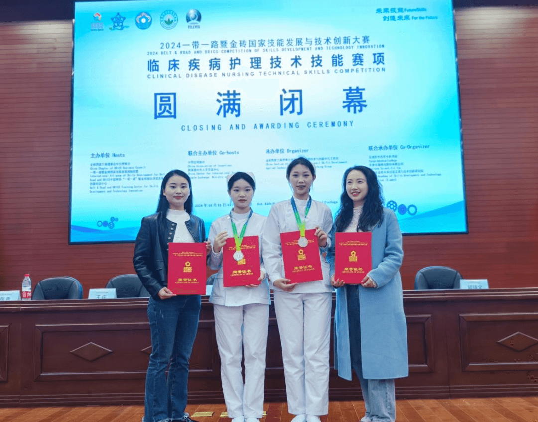 11月1日至3日,2024“一带一路”暨金砖国家技能发展与技术创新大赛之临床疾病护理技术技能赛项在天津医学高等专科学校顺利举办。我院护理系教师王一旭、吴明静指导的2023级护理24班学生刘星燕、任莹莹荣获临床疾病护理技术技能赛项二等奖,赛出了贵州参赛队的最好成绩。同时,我院荣获大赛优秀组织奖,王一旭、吴明静两位老师获优秀指导教师奖。