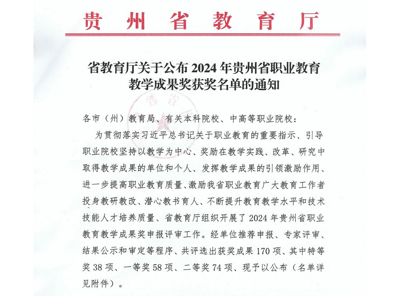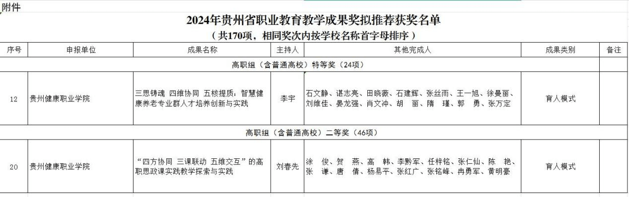 近日,贵州省教育厅公布了2024年贵州省职业教育教学成果奖获奖项目名单,贝博官网申报的《三思铸魂 四维协同 五核提质:智慧健康养老专业群人才培养创新与实践》荣获特等奖、《“四方协同 三课联动 五维交互”的高职思政课实践教学探索与实践》荣获二等奖。