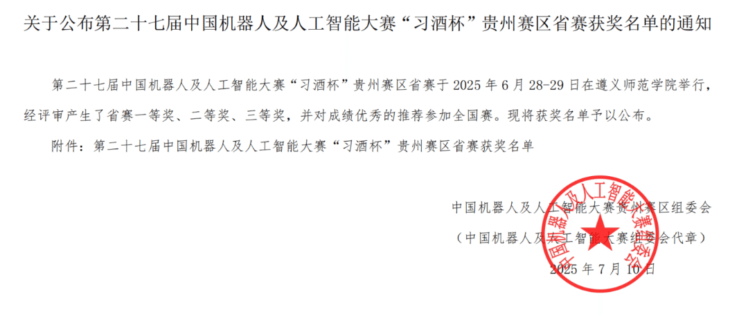 近日,第二十七届中国机器人及人工智能大赛“习酒杯”贵州赛区选拔赛在遵义师范学院顺利落幕。贝博官网派出的参赛队伍食光AI创翼队、协同智行队凭借扎实的专业素养崭露头角。其中由李乾、王磊老师指导的食光AI创翼队荣获省级二等奖,并成功晋级全国总决赛,协同智行队荣获省级三等奖。