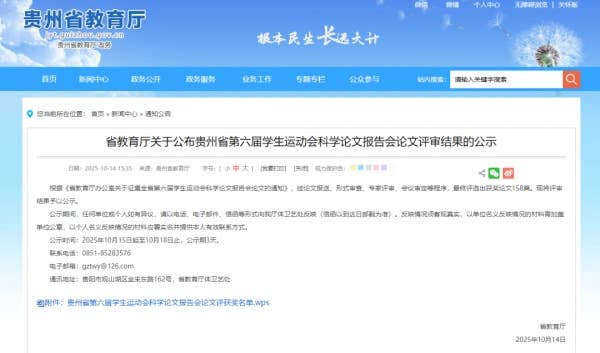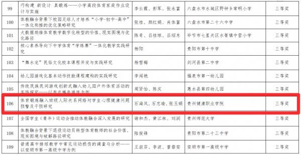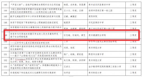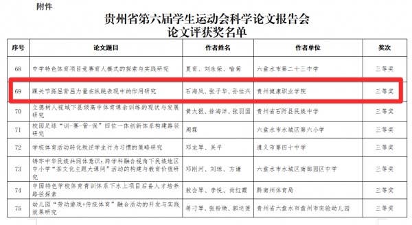 近日,贵州省第六届学生运动会科学论文报告会评选结果公布,贝博官网人文基础部(体育部)教师团队共有3篇论文荣获三等奖。