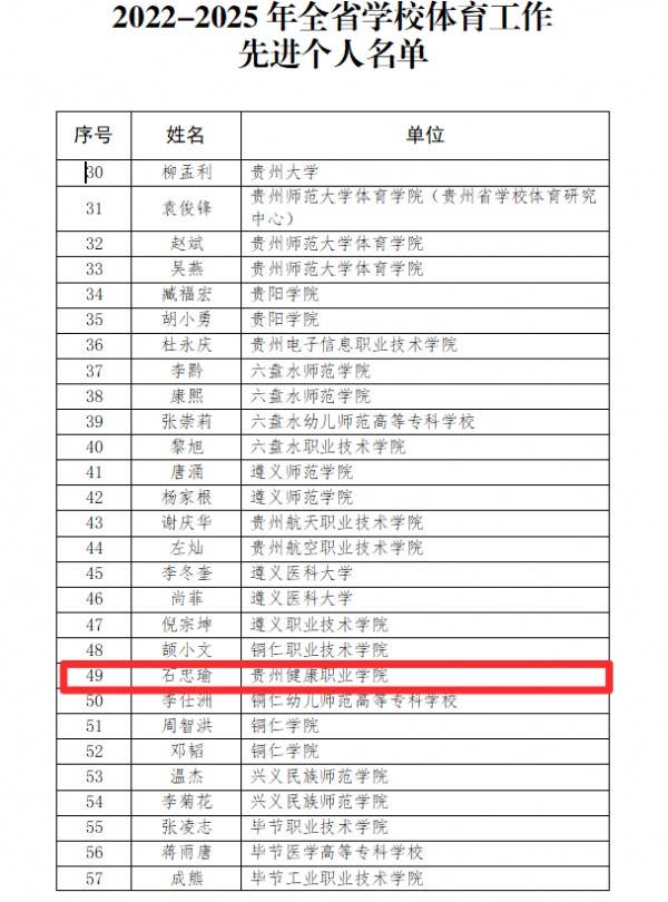近日,贵州省教育厅公示2022—2025年全省学校体育工作先进集体和先进个人评选结果,BB贝博艾弗森官方网站人文基础部(体育部)荣获“全省学校体育工作先进集体”称号,教师石忠瑜荣获“全省学校体育工作先进个人”称号。