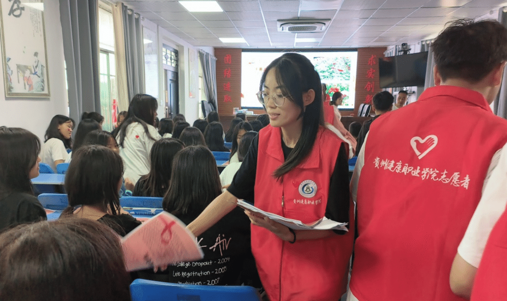 志愿者为学生发放禁毒防艾宣传单
