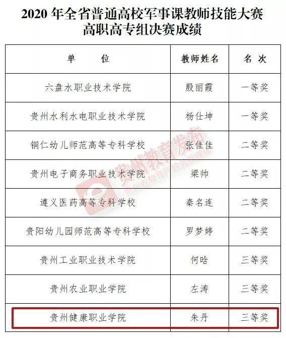 1123日,2020年贵州省普通高校军事课教师技能大赛决赛在贵州大学举办。经过各校初赛、省级视频复赛、省级现场决赛等赛程,我院朱丹老师荣获高职高专组三等奖。