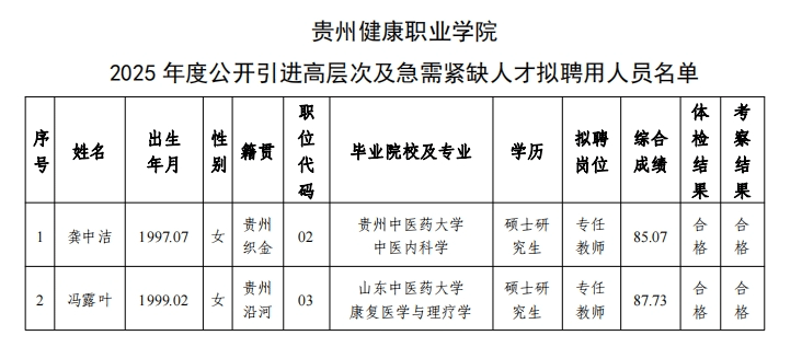根据《BB贝博艾弗森官方网站2025年度公开引进高层次及急需紧缺人才简章》《BB贝博艾弗森官方网站2025年度公开引进高层次及急需紧缺人才资格复审合格人员公示及考试公告》《贵州省事业单位公开招聘人员考察工作规范(试行)》有关规定,经资格审查、面试、体检和政审考察,龚中洁、冯露叶2名同志符合聘用条件,现进行公示,基本情况如下: